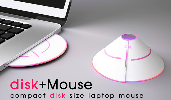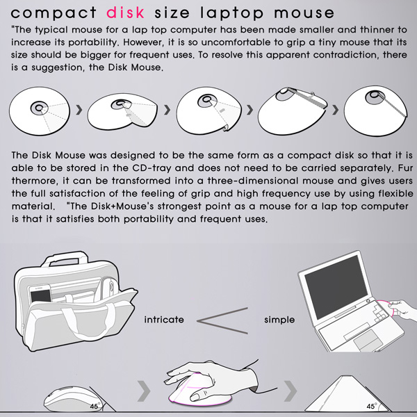 大家都知道鼠标是有弧度的,放到包里面总是滚来滚去不安分,而这个设计正是一个突破,采用的是光盘型的折叠方式,你可以直接把其放入光驱的位置,到你要使用的时候,就可以把其组合起来,成为一个圆锥形的鼠标,不过这个鼠标的操作手感要适应许久,要不然无法达到操控自如的境界;不过其它的鼠标产商是否可以从中吸取灵感,设计出突破性的鼠标呢。