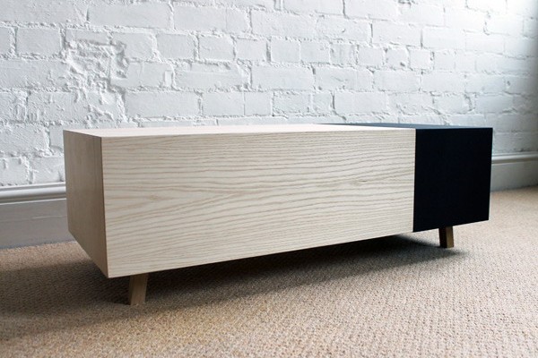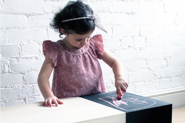 这是一个为孩子们玩耍而设计的新奇家具。它的造型简洁大方并且表面看上去并没有什么很特别的地方,然而茶几末端的黑色区域是设计师为小朋友们精心准备的涂鸦区(说白了就是小黑板),精力充沛的孩子们一旦有什么突发奇想就可以马上画在上边方便的很。
