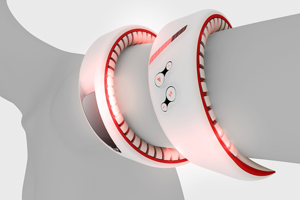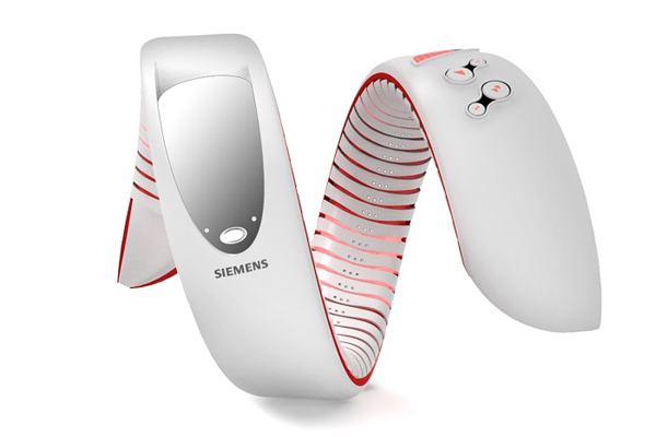 不得不承认,有些时候设计师的想法天马星空,这些想在有表达概念产品的时候更是表现极致,这是明基西门子的一款概念手机,它像一条白蛇一样,眩酷且富有魅力,必要的时候还可以搞搞恶作剧,吓唬吓唬你身边胆小的MM。 在夜晚的时候把它带在手臂上背景灯亮起非常的酷,不过,一个手机弄成这样的话不见得这种酷是谁都可以接受的。