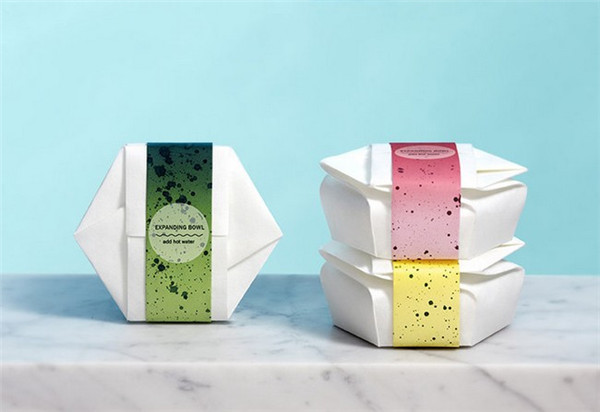瑞典设计团队Tomorrow Machine为方便面包装带来了一个干净、环保的全新设计。在研发咨询机构Innventia的帮助下他们研发了一种可100%自动降解的环保生物材料,用这种材料制作包装首先可实现扁平化节省运输空间;而在使用时 ,通过顶部预留的小口往包装注入开水后,整个包装就会膨胀和扩展成一个圆形碗,并随着温度下降而变得僵硬、坚固。这样新奇的方便小玩意儿,叫人怎么能不爱他?