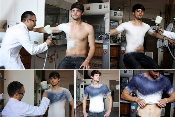 下面介绍一个非常有意思且新奇的纺织物喷剂,使用时我们可以用喷雾罐将它直到喷涂在人体上,与人体一接触它就会迅速变干,因此十来分钟就可以轻松喷制出一件完美贴合身体的紧身衣出来。而喷制出来的衣服除了能清洗,能重新穿在身上以外,更神奇的地方还在于如果你厌倦了这件衣服,还可以将它溶解为原料,再次用于喷制新的衣物。是不是惊到了哇?