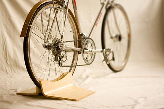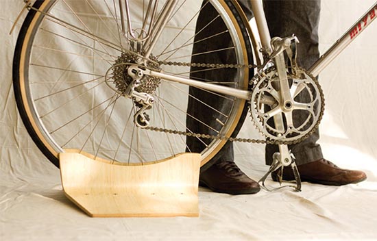 利用自行车轮胎的扁平优势让2个夹板固定住后轮即可让自行车立正。把这样的夹板固定在地上就可以停放自行车了。非常好的创意。如果你技术好的话,直接骑到上面就可以撒手不管了。自动立正停靠会骑自行车的你省不少心吧。