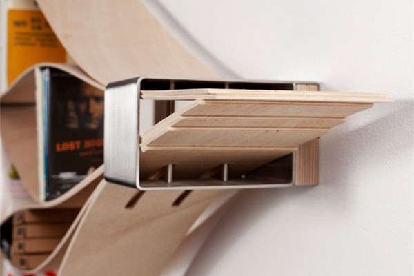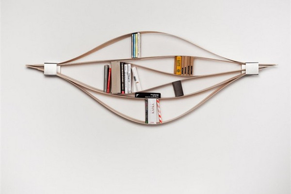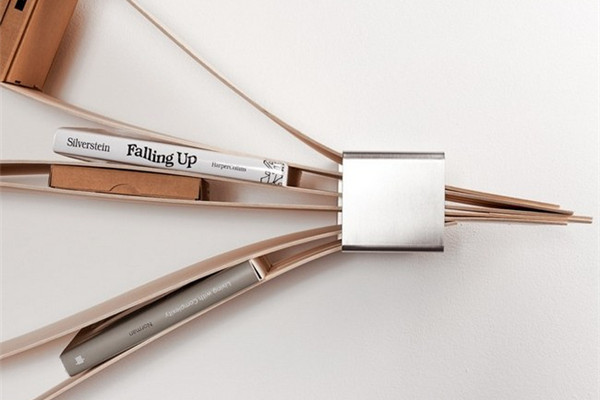 在我们生活中都认为书架是固定的,但这款新奇书架的两端由金属框架固定,将书本巧妙的夹在两块木板之间,利用木板的天然弹性将其稳定的固定。除此外,它的弹性也赋予了书架极强的灵活性,使用者可以随意调整书本的摆放位置,以改变书架的造型。