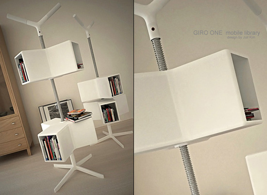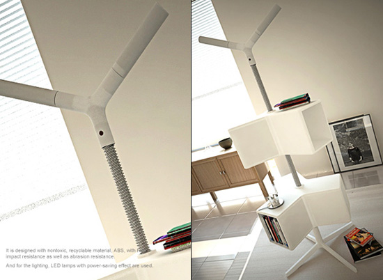 非常创意的书架,有了这款创意的书架可以自定义你自己的风格,高度和位置都可以通过中间的转轴旋转可以上升或者下降。书架模块可以自行组装。午后还能放一杯咖啡或者其他小物件,难得的是顶部还是一盏灯,非常周到的设计,可以看书用。书架设计师:Juil Kim。
