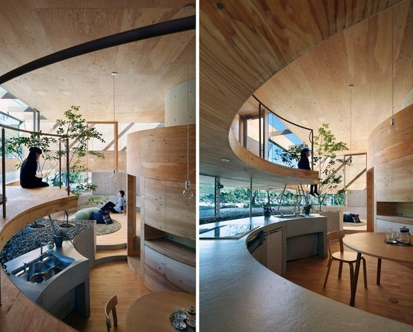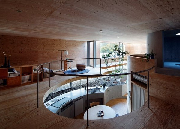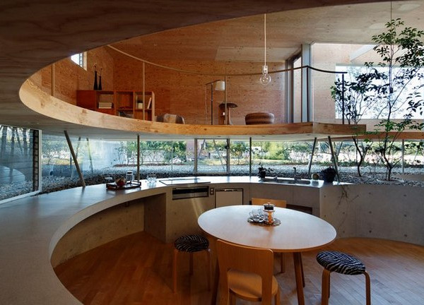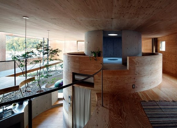 亲们,你们想拥有一个三口之家的房子吗?而这款住宅恰好满足了你们的需要。新奇建筑从地面抬高了一米,但在同时,起居室又往地下延伸,形成了一个下陷的开放式圆形空间,一道玻璃墙将之围蔽,让自然光线点亮室内并打通室内外的视线交流,一些葱郁的小植物点缀其中,模糊了室内与室外的界限。