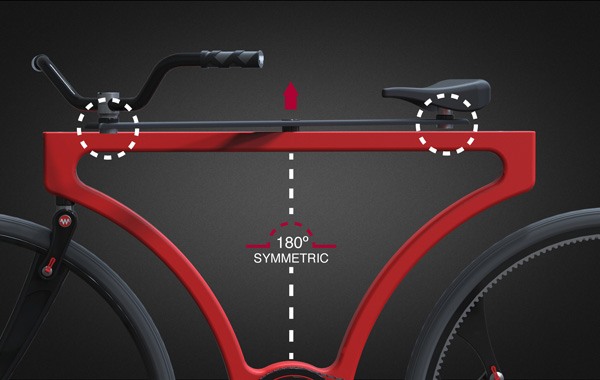 双向自行车(Twist Bike)是由设计师Jose Hurtado带来的一个新奇概念。将原来的那些链条等全部抛掉,以极致简约的形像展现,也使得每个组件拆除起来更容易、以方便修理和存储 。而主体框架的完美对称性,则让车把与座位连杆可以随时180度旋转,以组合成有趣的双人自行车。