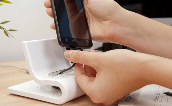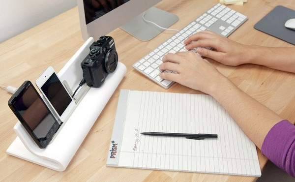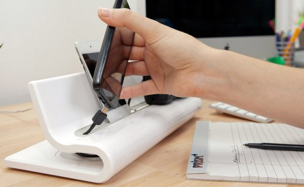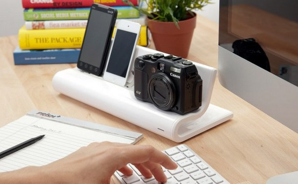 亲们,你们有没有发现各种设备充电时,时常出现电线相互缠绕,让原本整洁的桌面变得杂乱不堪的局面。而这款新奇设计简洁流畅的充电底座为此应运而生,可以同时让不同品牌的手机、平板电脑、相机等多数码设备靠立在底座上充电,并把各路电线隐藏在底部的夹缝中,留出一个干净舒爽的桌面。