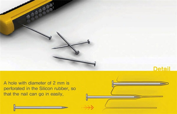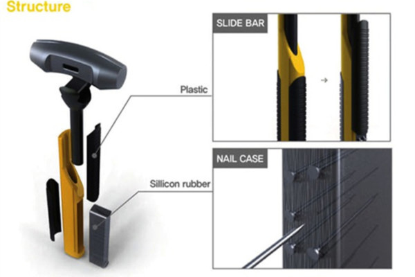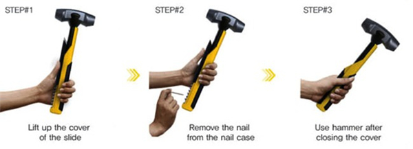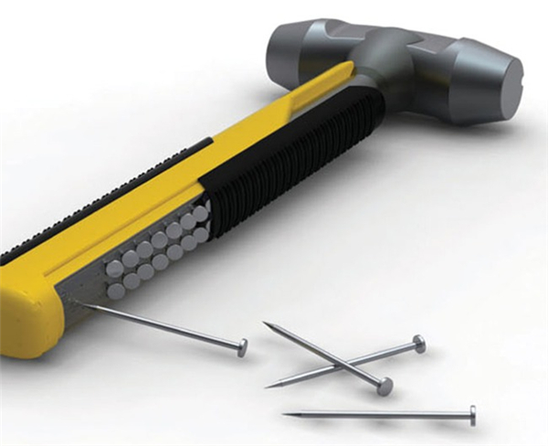 经常看到正在装修的一些房屋中有着这样的一群人,他们嘴里含着钉子,口袋里放着钉子,连手上都拿着钉子。你一定可以猜到,他们就是木匠,他们其实不想这样,现在给大家介绍的这个新奇的收纳钉子锤可以帮助那些木匠,他们可以将它放在锤子后面的小卡槽里,这样既安全又方便。犀利吧?