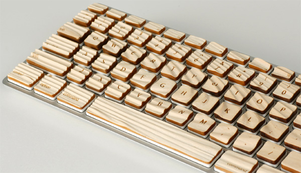 这是一款设计新颖的木质键盘,名字叫做Engrain Tactile,键帽是用木头打造的,上面带有的木头原有的纹理手感手感很棒。轻敲键盘会有欢快的触感,还不会产生静电,感觉就像苹果笔记本的键盘。这款键盘的设计师曾经在材质上煞费苦心,连石头,玻璃,动物皮都有实验,经过反复实验还是木头的质感最好。