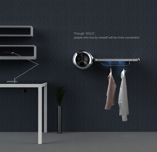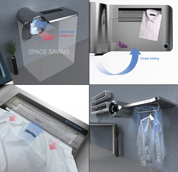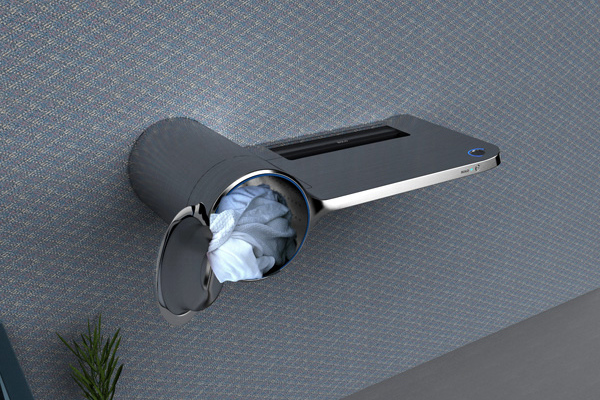 这是一个一体的化的洗衣机,它可以做到正常洗衣机可以做到的一切,并且还可以熨烫,挂晾,关键是它的空间设计决定了它还是一个绿色环保的省水洗衣机。从空间上来看,它不会占用家里多大的空间,采用壁挂式的设计,着实是时尚高雅上档次好多,遗憾的是它目前还仅仅是一个概念产品。
