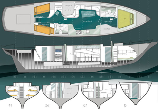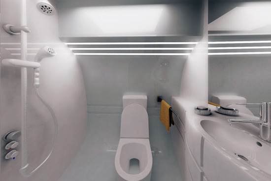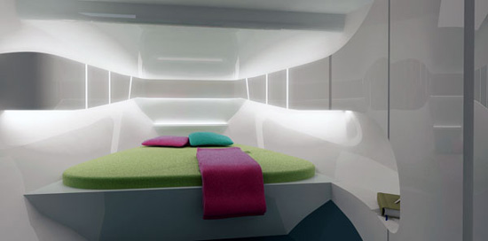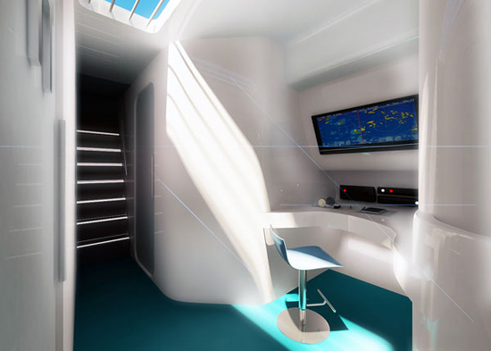 这是设计是Adelina Popescu设计出来的一个时尚的的船舱,大量的流线型设计加上抛光处理的墙面,清爽的蓝色搭配简约的白色,以及镶嵌式内置led灯共同造就了超现代风格的游艇船舱市内设计。尽管这只是一个虚构出来的,但是这样出奇的设计还是别人非常神往的。