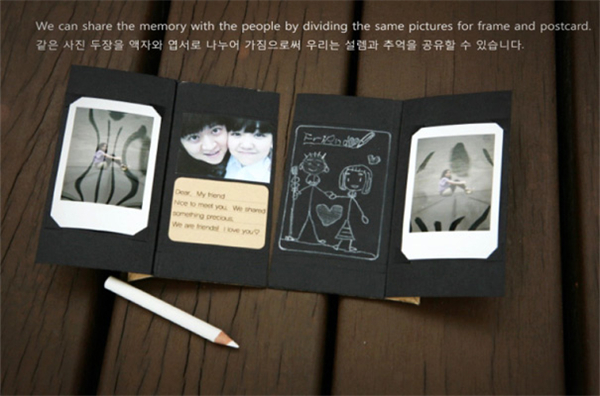亲们,想不想拥有一个个性的拍立得机器呢?嘿嘿嘿。现在介绍的这个明信片相机相信大家一定会爱上它,因为,它会把影像分别捕捉到盒子里面已经绘制好的两个框架中,把盒子拆开,就可以得到两张含有照片的明信片,并且,你可以在盒子两边写上你对朋友的祝福。这样的个性明信片,相信你一定会喜欢吧~