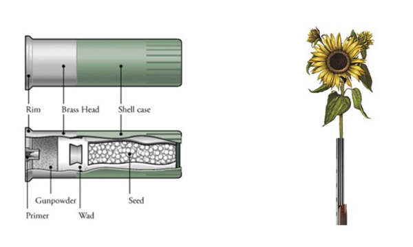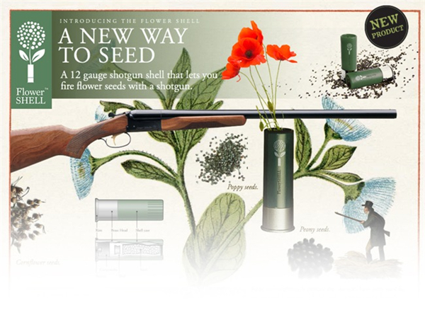 大伙们,家中有养花的举个手!你们一般种花都怎么种的?现在给大家介绍一个神奇的子弹。它是实实在在的霰弹枪弹药,但经过无数次的反复试验,设计师将其中的火药份量减少到了最合适的程度,但同时,里面填充了牡丹、百合、牵牛花等种子。这样,当你要开始种花的时候,就可以把锄头丢到一边,换上弹药,来一发吧!
