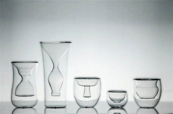 大家平时使用的玻璃器具一般都是很普通的那种里面一层的。但是现在给展示的这个器具是里外都有一层的创意玻璃器具,它是由北京的KDSZ设计工作室创造制作的,相比以往的单层杯具,它外观更具可造性,当你在容器里面注入不同的液体,它就会呈现出不同的景观,非常漂亮。