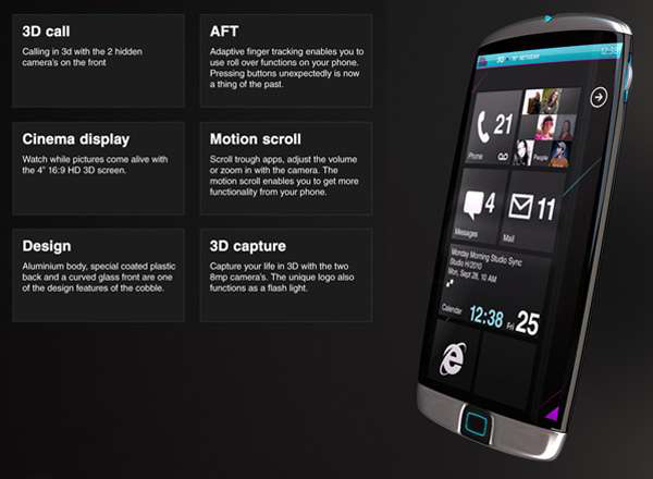 这是一款Windows Phone 7以操作系统的概念手机,使用的鹅卵石造型,采用顶级水准的制造工艺进行无边框设计,屏幕的大小为炫酷4寸高清裸眼3D显示,屏幕光滑如丝,搭载的微软最新WP7系统给你惊叹的触摸体验,样式看起来非常的时尚典雅。