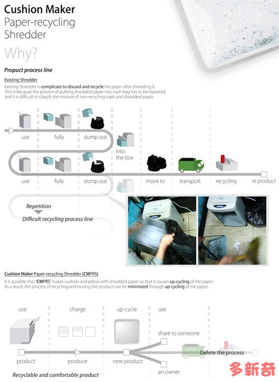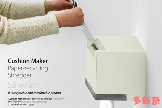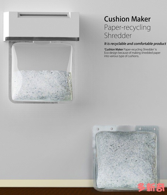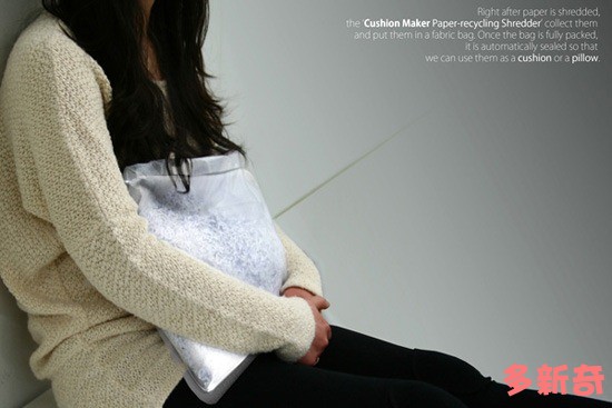 这个新奇的东西非常的环保,通常用碎纸机撕碎后的废纸片只能扔进垃圾桶,太小也不好回收,有没有更好一点的方法来回收利用呢,这个纸质的靠背抱枕为我们解决了这个问题。通过把碎纸片用靠垫大小的袋子装起来变成一个实用的靠垫或者坐垫。或许没有棉花有弹性跟舒服,寿命也不会很长,但是从环保的角度出发,至少是一个美丽的靠垫,可以给您平常应急使用。设计师:Gyeongwan Koo (Oliver)。