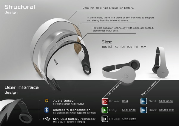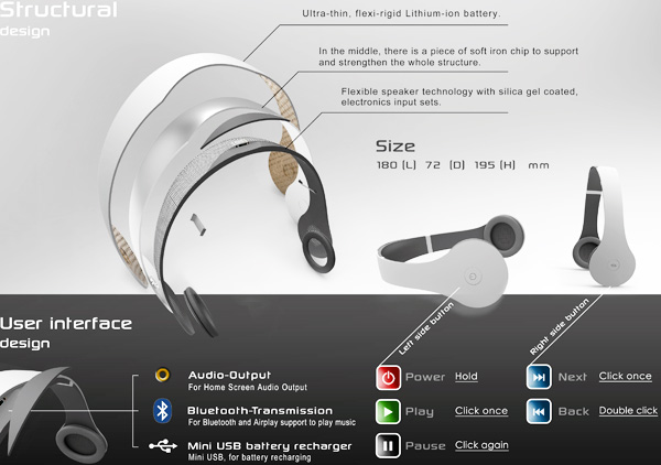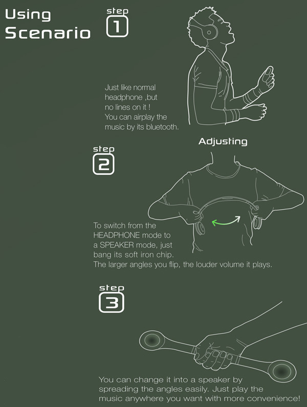 这是一个耳机还是一个音箱?答案就是看你的需求,你希望它是一个耳机直接放在耳朵的两边夹起来就是耳机,你希望它是音箱那么把耳机掰开那么它就是音箱了,非常巧妙的设计,在掰开耳机的时候就自动切换到独立的扬声器单元,用来放大音量。耳机自带蓝牙,耳机听筒2端有常用的播放器按钮。可以对播放器进行简单的播放,暂停,下一曲等操作。简单方便。可以摆脱“线”的束缚。