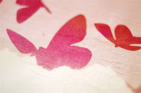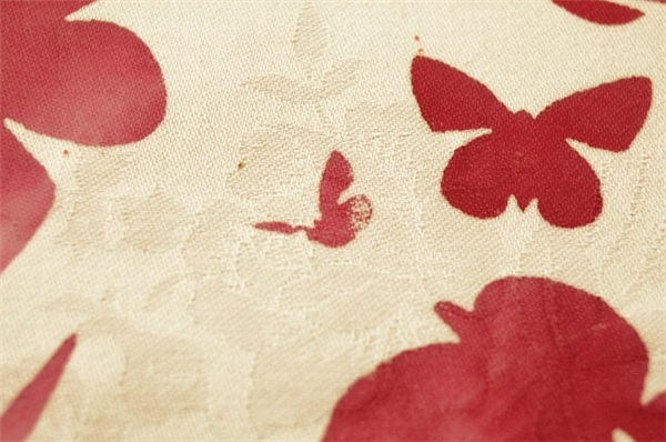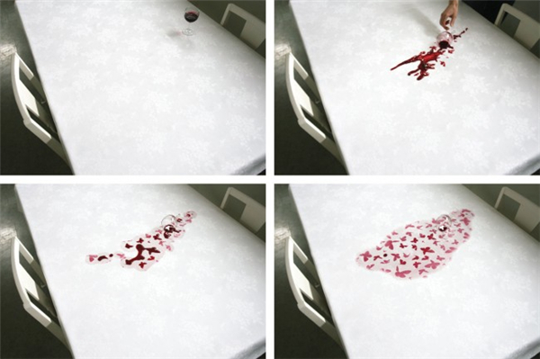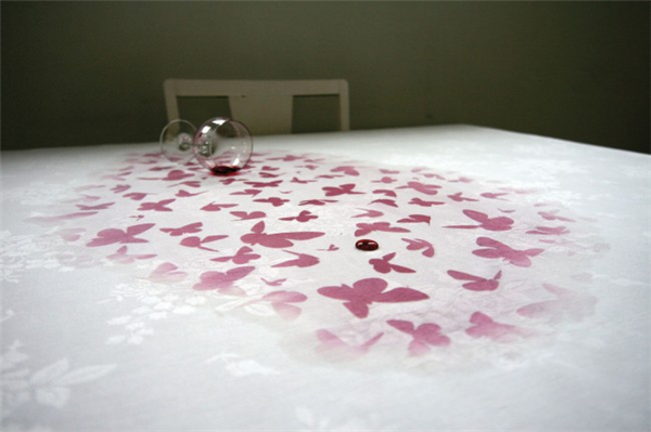 亲们,来看看吧!一款全新的桌布,设计师将蝴蝶图案隐藏在桌布里面,而桌布是采用的是全新的材料制作而成,只有在桌布一不小心被打湿之后才可以显现出这些图案来。一般的当事人打翻红酒的时候,是非常尴尬的,但现在不一样了,有了这款个性有趣的桌布,即使是你在遇到以上这些尴尬的情况之后,依然可以一笑置之好么!