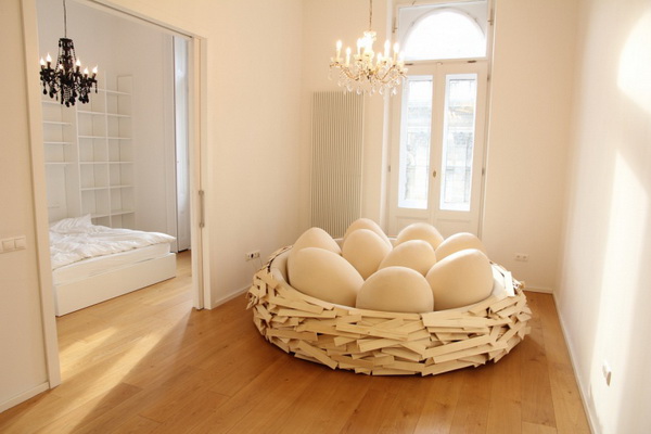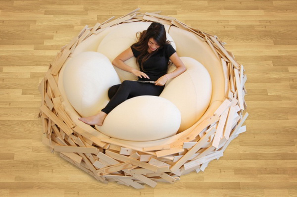 亲们,现在给大家介绍一款非常牛叉的家居设计,设计师利用木板和柔软的垫子打造的这款鸟巢造型的家具既不是床更不是一款沙发,而是诠释舒适的新型创意产品。而且,画面是真尼玛的美好么?鸡血哥光是看到这么美的画面就已经醉了,亲们,你们现在系不系还在睡觉纳?要是有这样的家居在家,也是好温馨的说哇!