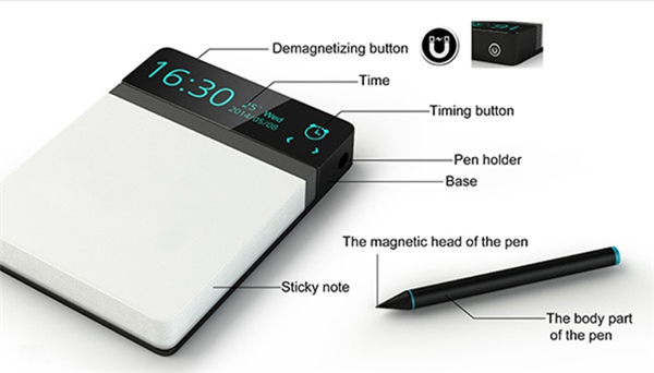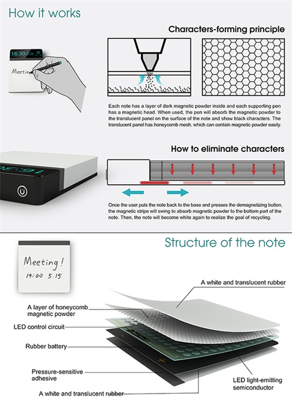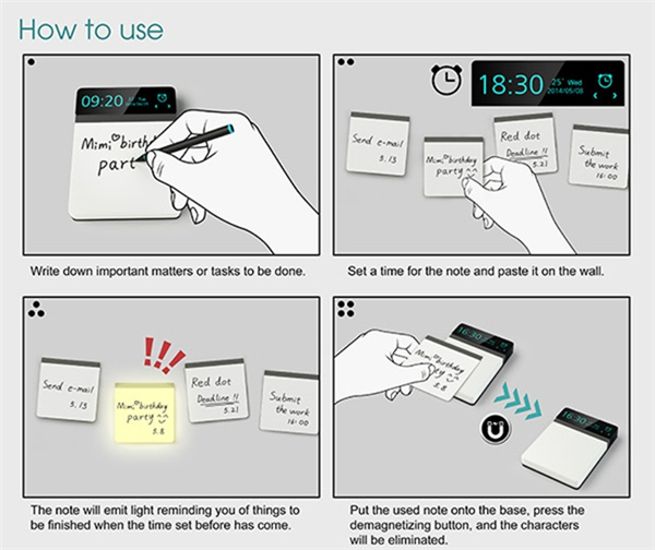 传统的便签一般都是由纸张制作,并且,用一次一般都丢掉了,非常浪费。针对这个问题,Sun Jin带来的一个概念。由智能底座与便签板组成,原理类似于给小孩子制作的磁石画板,使用时可用磁性笔带动便签板里面的磁性颗粒排列成字,并通过智能底座设定闹钟,当时间到了,便签板就会发光起到提醒作用,用完后将便签板放回智能底座中退磁,就可以重复使用。非常方便有木有?
