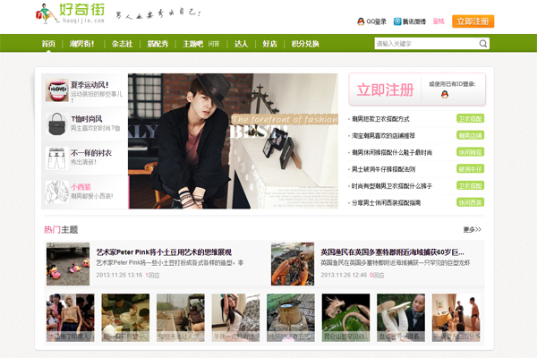 好奇街,最大的时尚男装购物分享社区,百万网友一起发现时尚、分享购物乐趣。在这里可以找到网友分享的最佳时尚潮男单品和最靠谱的网店,看型男搭配秀,品时尚杂志,逛男人街。还可以成为最受关注的时尚潮男达人,享受粉丝们的热情追随。