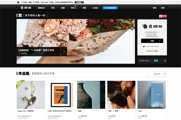 觉 (JUE.SO) 是一个创意孵化平台,通过整合发布、宣传、销售、生产、品牌合作等方面的渠道和资源,我们帮助创作人把想法和项目落地。项目是你用来传达你最本质想法的方式,你可能是想做一个极具创造力的作品,又或者是你只是想做一个不一样的U盘,也又可能你是想建立一个巨大的品牌。但关键点在于,告诉所有的人,你是谁,你的想法从何而来,你又想如何计划让这个想法最终实现。项目并不是一个销售平台,项目的意义在于你可以利用他来完善你的产品或者想法,并且通过无数人的头脑风暴,使你的创意变为一次社会行为,从而让你的想法影响更多人,感染更多人。