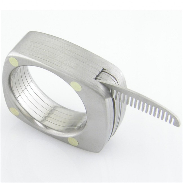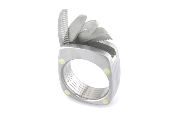 亲们,一般戒指,你们会想到它的作用么?很奇怪的问题吧!鸡仔也觉得,戒指,不就是用来装饰自己,或者显示自己身份的嘛!嘿嘿~那如果让它也变得实用会是怎么样的呢?珠宝制造商Bruce Boone将戒指开发成四种实用的迷你工具:开瓶器、直刃、锯齿刀片和一把迷你小梳子。我想知道设计师,你介么叼,你爸妈造么?