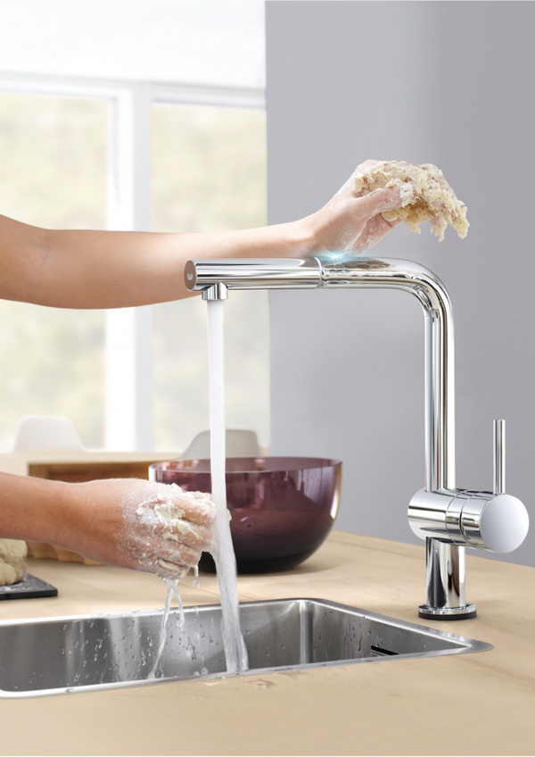 福利福利!绝对的福利好么?经常在家做饭的小伙伴们,是不是时常遇到这样的状况。在厨房忙忙碌碌的为家人准备呗佳肴,手上沾满了面粉或者需要用手搅拌的蔬菜和调料,这时想要用水是件麻烦的事情。而这款由水龙头制造商 GROHE 开发出的一款应用了可触摸技术的创意智能家居产品就能完美帮你解决以上问题。轻轻触碰水龙头上方,你就懂了!