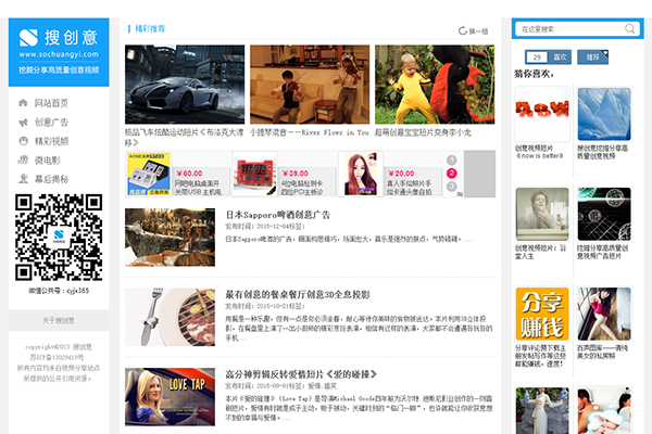 推荐理由:搜创意网站,是专门的创意视频分享平台。实时不断分享全球最新最具创意的广告,视频短片,微电影等。为您带来思想或者感官的冲击。希望我们挖掘的视频,能让您“哇”的惊叹一下。