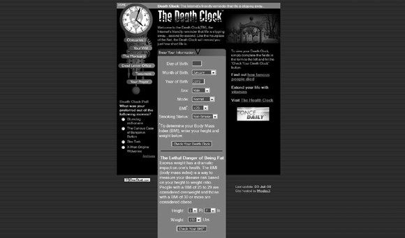 有没有想过,未来的你会是在哪个时间死去,又是在哪个时间开始重生。这是一个国外的网站,打开它的网页后,根据实际情况填写你的相关信息,它就可以预测出来你的死亡时间,在填写完相关的信息后,点击确定后即会弹出一个你生命倒计时的窗口。不过这个只是用来娱乐罢了,用现在网络上比较流行的一句话就是,如果认真你就输了。附上网址:http://www.deathclock.com 。