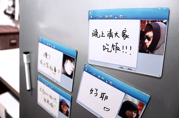 这是意外设计带来的一款超正的玩意 — 对话框的留言便贴/冰箱贴(Dialog Box Magnet),上网的人绝对不会对这玩意感到陌生,这是一个标准的聊天工具的对话窗口,只是变成了磁贴/冰箱贴,可以直接用白板笔在空白位置写下留言,不需要按下Ctrl+回车就能让人看到,直观又有趣~~有MSN和QQ两款对话框。产品使用2毫米厚的软磁铁制成,表面是高质量的光面纸,可重复擦写。自带一支黑色白板笔,笔帽上有刷子可擦除笔迹。比起用完即丢弃的纸质便签纸,对话框留言磁贴/冰箱贴 (Dialog Box Magnet)更环保,更有创意。