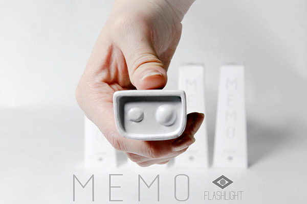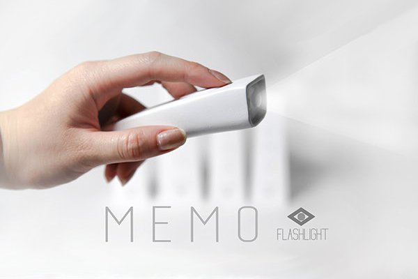 Memo 是一个高科技,小巧轻便的手电筒,谁能想到这个简单的手电筒有别的功能呢?它具备拍摄、摄像和投影机功能,专为夜间所准备,光到哪里照到哪里,可以简单的按一下上面的按钮即可拍摄,然后存储到内部,再通过USB导出。