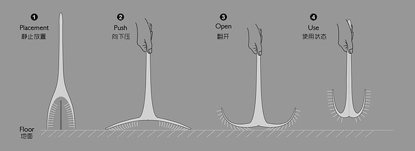 简洁的设计总会是最好的设计。这款马桶刷采用了张合翻转的方式工作,如同“开花”一样。没有用繁琐的装饰来约束它 厕所刷里面全是刷毛,可以压在平坦的表面和杯状表面翻转外刷,杯状厕所刷还可以当厕所吸盘用,这个马桶刷设计的灵感完全来自花朵绽放的灵感。从花苞到绽放,厕所刷演绎的很棒。