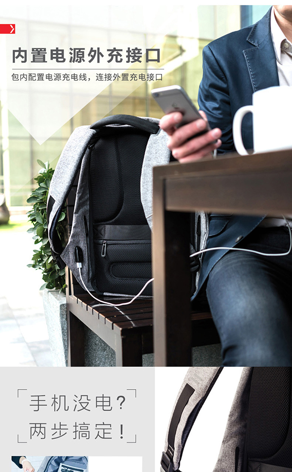 蒙马特背包的外层精选 600D 面料、6mm 防冲撞海绵层、双层夹面料、高聚物聚丙烯防割保护 PP 装甲,可以有效的防水。另外包里设计有充电线,逛街时手机没电也不用掏出充电包数据线,背包有内置电源外充接口,可以连接移动电源与外部设备,轻松充电,再也不用把充电宝拿手上,或卡在拉链缝里了。