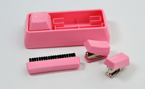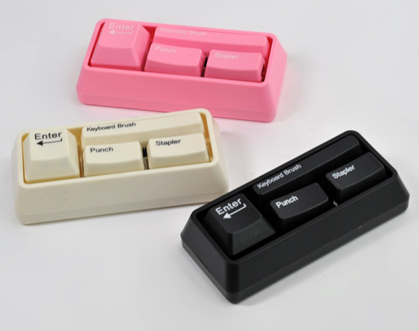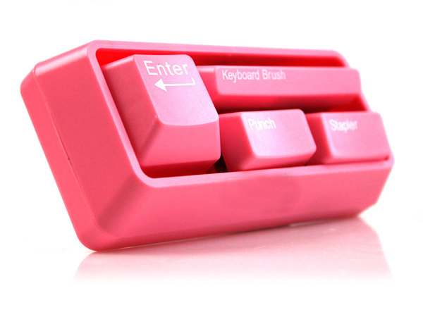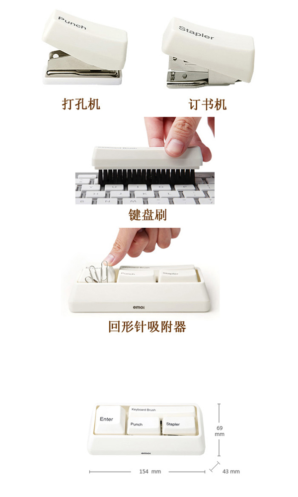 这是一个神奇的小键盘,里边有4个按键,每一个按键都是一个办公好手。这个多功能键盘将各4个常用的文具组合起来,键盘一变身,能化身为打孔器、订书机、键盘刷,有趣的键盘造型,装点办公桌面,尺寸不大,便于出差随身携带,不仅美观还非常的有爱。淘宝购买
