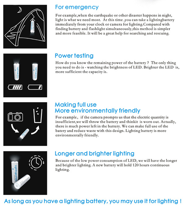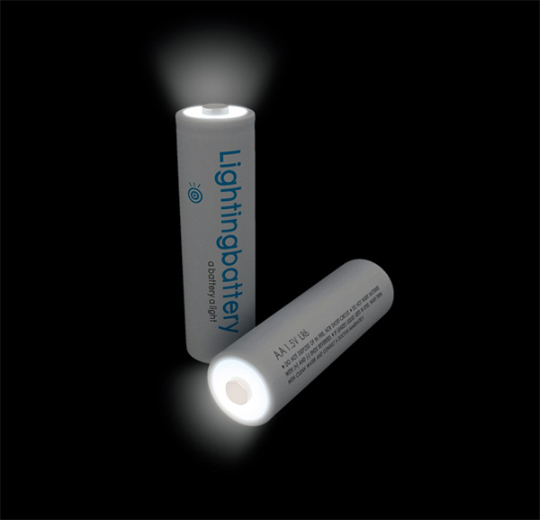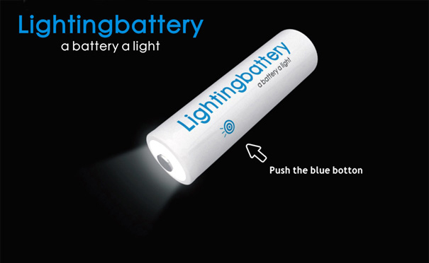 这是一款带LED灯泡的电池Lighting Battery,外壳有一个开关,需要紧急照明的时候只需要一节电池就可以了。不过这只是一个概念设计,实物并没有生产出来。相信生产出来的难度也不会有多大,可能是市场的原因,这款设计仅仅只是在传统的电池结构上增加LED灯泡和电线,,LED灯泡耗电量低,设计上一节新电池可以持续照明达120个小时,这样家里面有的时候闲置的电池就不会无处可用啦。