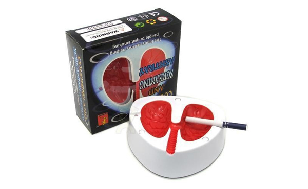 不知情的吸烟者猛然听到这种可怕的咳嗽和惨叫时惊吓的表情,也是一件非常有趣的事情。这个烟灰缸的真正强大之处在于装上2节5号(AA)电池之后合上电池盖。感应式,当烟放在其中一个夹烟槽内,肺就会发出被点燃般的惨叫。当烟放在另一个夹烟槽内,肺就会发出烟熏般的狂咳嗽。可以送给你身边经常吸烟,以及你很关爱的人,但是送之后要告诉他这个情况哦,否则吸烟者可能会被烟灰缸的样式和声音吓到。淘宝购买