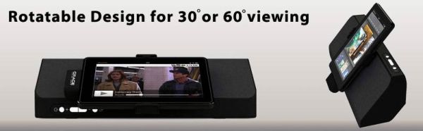 这款音箱还可以帮助设备实现翻转和倾斜功能,可以完美地从电子书跳向至电影界面。此外,音箱还配有一块可充电电池,外部连接一个迷你操纵杆,以供户外时调试聆听效果。