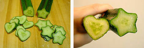 日本的菜农还是很有创造力的说,看看这黄瓜就知道了,切出来就是心形和五角星的形状,调出来的凉菜就算不好吃至少也很好看啊. 这是用各种类似模具的外框,在黄瓜刚刚长出来的时候就套在外面,小黄瓜不断长大就长成人们预定的模样。