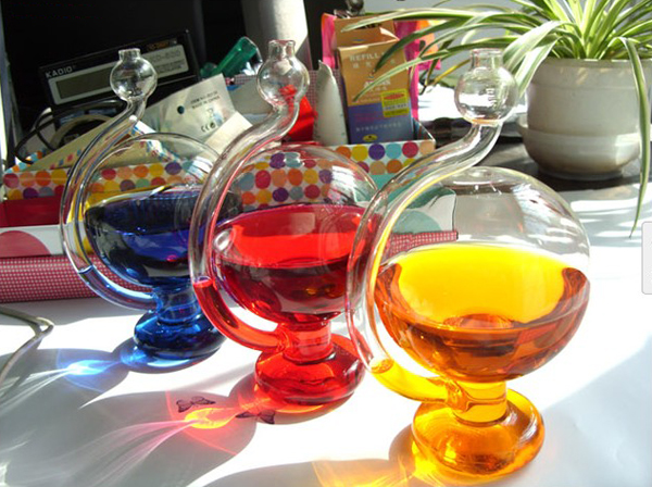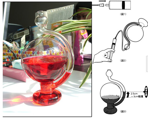 天气预报瓶(源于日本:晴雨予報グラス)不仅个很漂亮的室内装饰,它还能根据气压变化,为你预测出次日的天气情况,是不是很神奇。今后不用相信“天气预报”那种封建迷信了,自己在家就能预测天气。天气预报瓶由玻璃制成,晶莹透明的球体,但没有地球大陆图案。里面用于侦测气压的液体,可以根据你自己的颜色喜好,用水和水溶性颜料兑制而成。淘宝购买