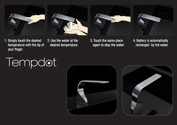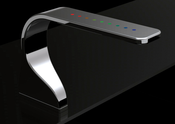 下面的这个水龙头可感应式的水龙头,与现在我们是常生活中用到的感应式水龙头不同的是这个感应式的水龙头是可以进行温度调节的。在水龙头的上边有有多个颜色的小点,从红色渐变到蓝色,蓝色的那边是温度相对较低的水,红色的那边是温度相对较高的水。在使用的时候,在手在水龙头的上边一晃即可以得到理想温度的水。