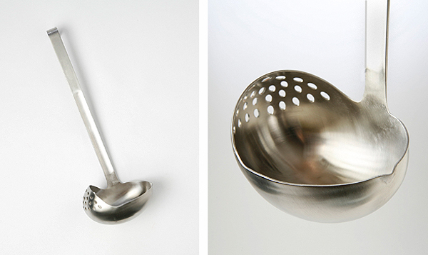 汤勺和漏勺结合在一起是什么样呢,来看一看。进过厨房的朋友肯定知道汤勺和漏勺了,吃鸳鸯火锅的时候这两个家伙一定是在锅里躺着的。设计师为了考虑到了这一点,那就是下面这个汤勺和漏勺结合体了。只需要一只手就可以灵活的运用它,想盛汤盛汤,想捞肉捞肉。我觉得国内的呷哺呷哺吃火锅的时候就应该提供这样的勺子,这样吃客们可就省事不少啊。