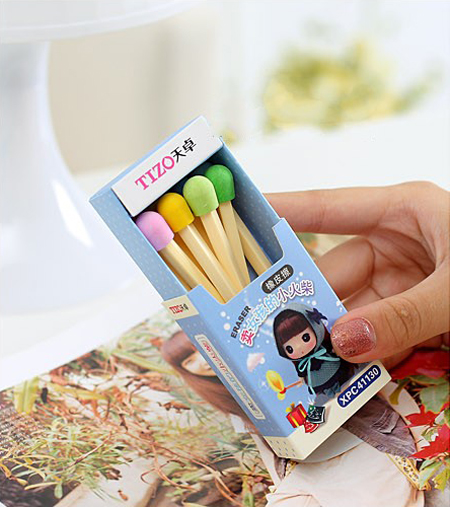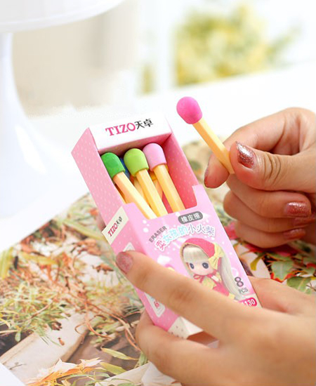 工作了后就很少使用橡皮擦了,记得在小时候读书的时候都是买了一块新的橡皮用自己制作的好看小盒子装起来,然后再用透明胶带包裹起来,特别的小心使用。有了下面的这个火柴橡皮擦之后,相信你也一定会更加的小心使用了,因为橡皮擦的外形都是设计的非常好看而且时尚。这上彩色火柴样式的橡皮放在一个名“卖女孩的小火柴”里面,非常的可爱。送给家的小孩子小学生他们一定会非常的喜欢。淘宝购买