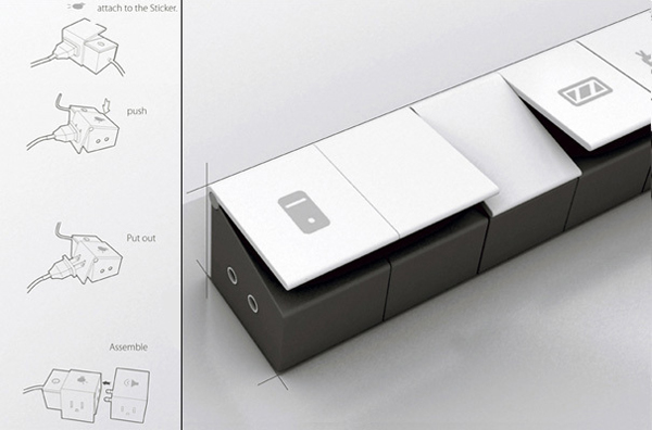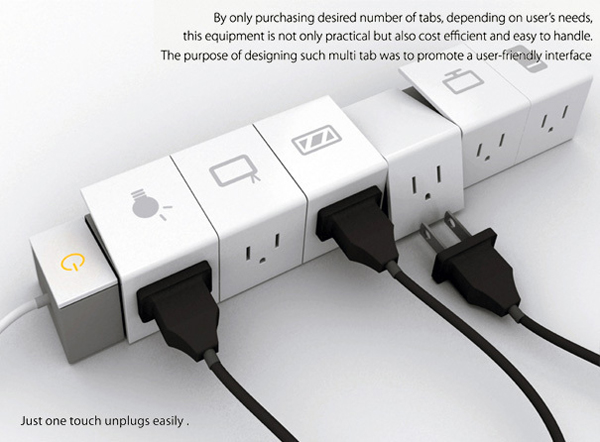 由Soon Mo Kang设计的Multi-Tab Power Strip,和以往的插座和延长线不同的是,以往插座使用的数目都是越来越多,延长线彼端接头常会连接数个,有时候时间一久了会分不清楚插座是连接哪个接头,有了这个带标签的插座后一切就都变得简单了。在每个单位上都有相应的标签用来提醒每个插座的用途,可以方便整理和收纳。不需要用的单位可以移除,等需要使用时在插上即可。