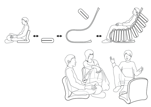 这个看起来有点怪的摇摇椅实际上是可以分出来好多小椅子出来的,现在是分享的时代,家居当然也不例外了,在城市寸土寸金的地方,公寓里的家居摆设都是精挑细选、合理规划安置的。平时Shair就是张沙发式躺椅,当来朋友了,得有个地儿一起坐坐、喝茶、聊天时,它就分出好多柔软的小凳子出来,只需取下软垫,垂直打开就完成了变身,非常的方便和实用。