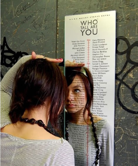 不用怀疑,这确实是一面镜子,只是照出的不仅仅是容貌,还能测量出身高,更重要的是它还要以测量出你和伟大心灵的差距。这面镜子上有可以测量身高的刻度,每个刻度上印有与这高度相关的名人名字,有珍妮佛洛佩兹、德雷莎修女、加里科尔曼等等,大概有100多位名人。你可以天天在照镜子的同时与名人比高低。高大的人不必骄傲,矮小的人也不必气馁,相对于身材的高度,心灵和智慧的高低才有意义。