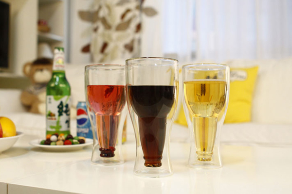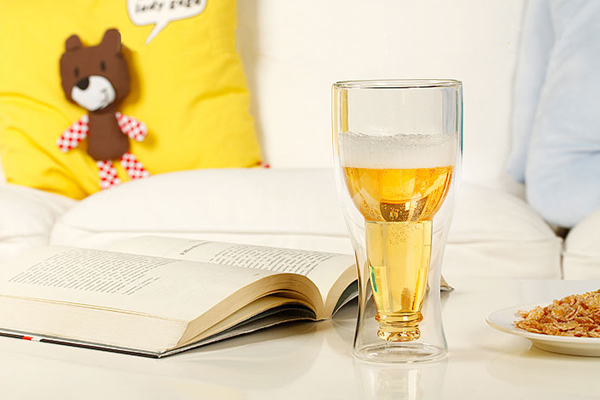 翻转快乐,这是一个双层的玻璃杯,外面一层是普通水杯样式,里边一层是倒立的啤酒瓶样式,双层杯壁可以有效的隔温防烫。采用先进的人工吹制技术完美呈现,比普通玻璃更加轻盈坚固,长期使用仍然通透如新。待里边装上啤酒或者饮料后看起来非常的赏心悦目。