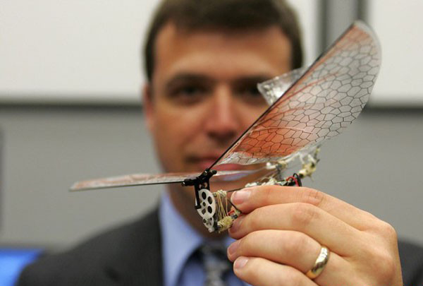 在美国俄亥俄州赖特·帕特森空军基地实验室,微型飞行器(MAV)研制小组组长帕克正在展示一架微型扑翼飞行器。美国空军MAV小组致力于开发微型军用飞行器,以应对复杂的城市作战环境。飞机的设计非常的现代,小飞机上还有一个仿真的翅膀。