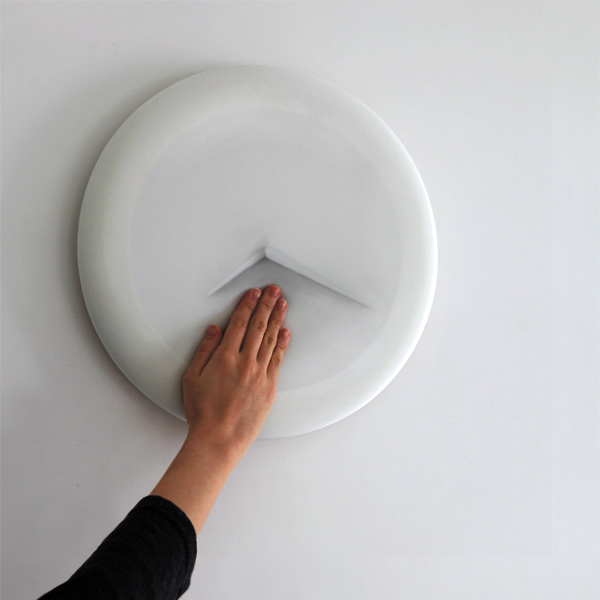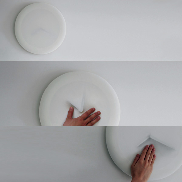 这是一个很新鲜的时钟,它显示的时间不是一下就可以看出来的,是需要摸出来的,不需要用眼睛看,伸出你的手触摸一下就可以知道现在的时间了。它的原理就是指针不是在表面,而是在内部,如果需要看时间,按压它柔软的表面即可显示出来。