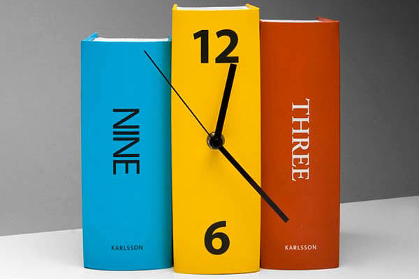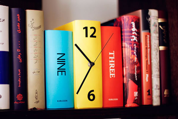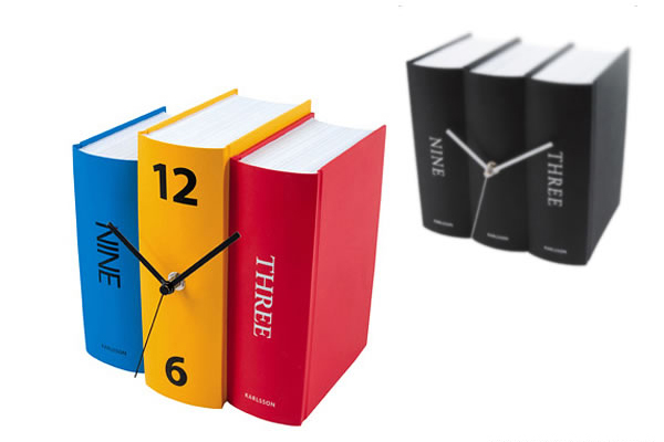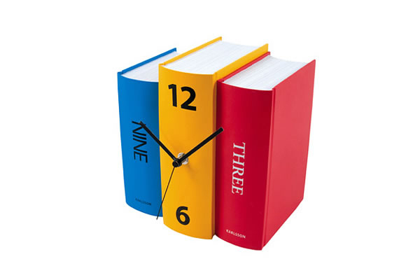 这是一个来自 Karlsson 的创意书本时钟,放在书架上,和书本没什么两样,但是它却是一个时钟。放在你的书架上是不是显得跟其它的书都有一些不合群啊。它由三本书组成,左右两边的两本书是三点和九点的英文,中间的那本书上标记的时间是十二点和六点。